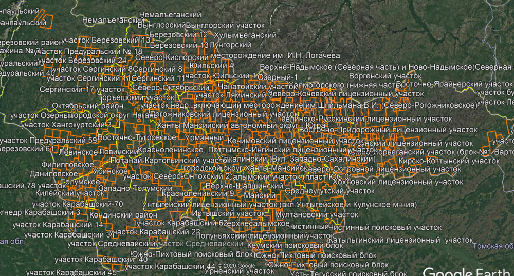 Продам карту лиценз.участков УВС ХМАО( и карьеров)+контура рек и озер для Гугл Земля.