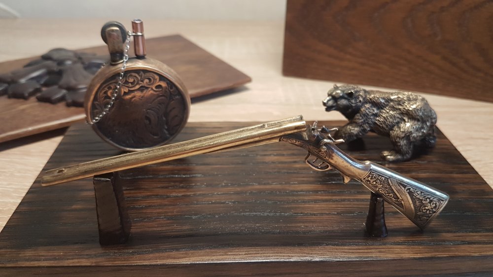 Всем доброго времени суток. Продам настольный набор , ручная гравировка с патинированием на ружье и бензиновой зажигалке. Все изготовлено из бронзы. Подставка с коробкой из дуб/ясень. Размеры 10\20\10 см Цена 8000р, отправка по РФ 89991414108