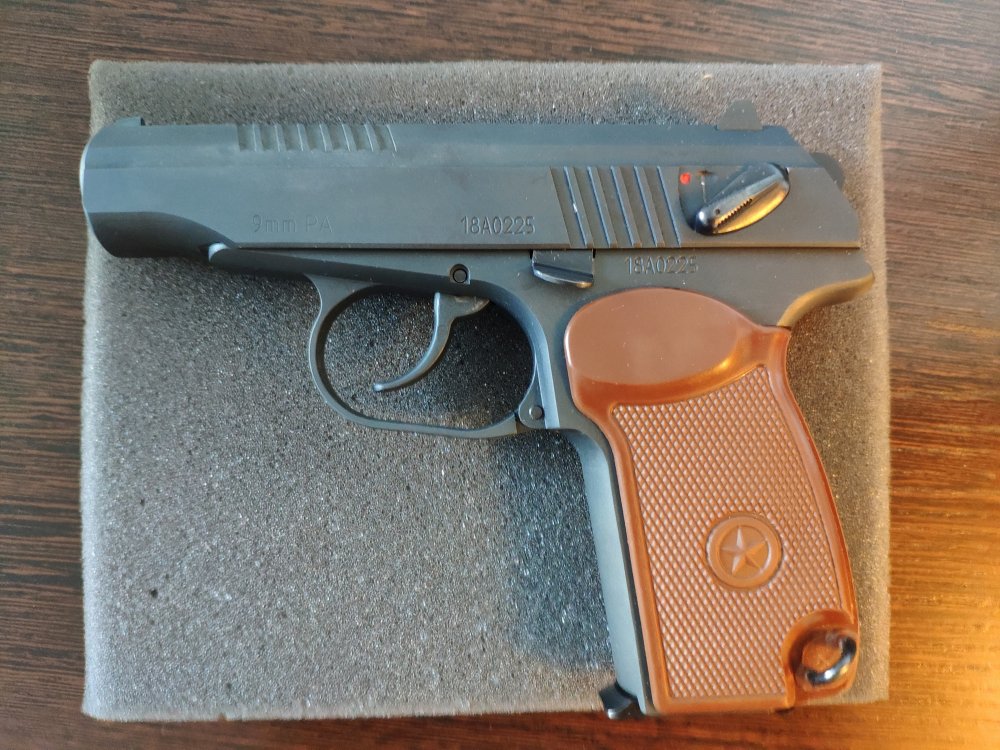 Новый, ни одного выстрела. В комплекте кобура и 50 патронов.