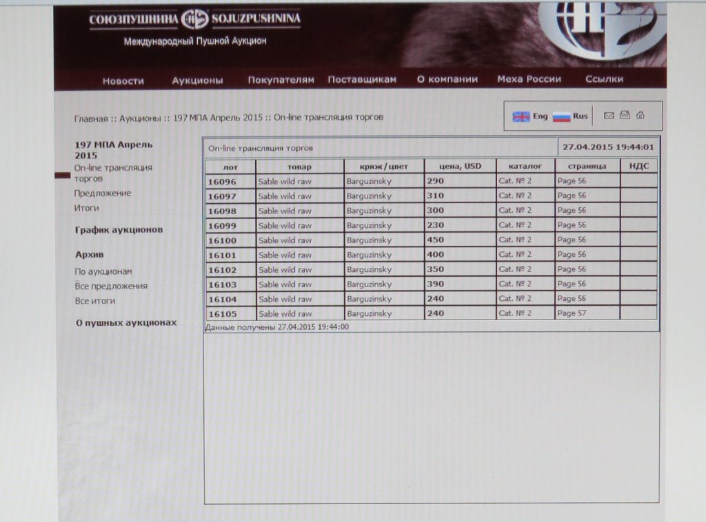 Проснулись. :D Мелочевка быстро пролетает. Вчера в полный рост уже диким соболем торговать начали. Топ-лот за 3600 баксов продался. Торги остановились на вот таких цифрах.