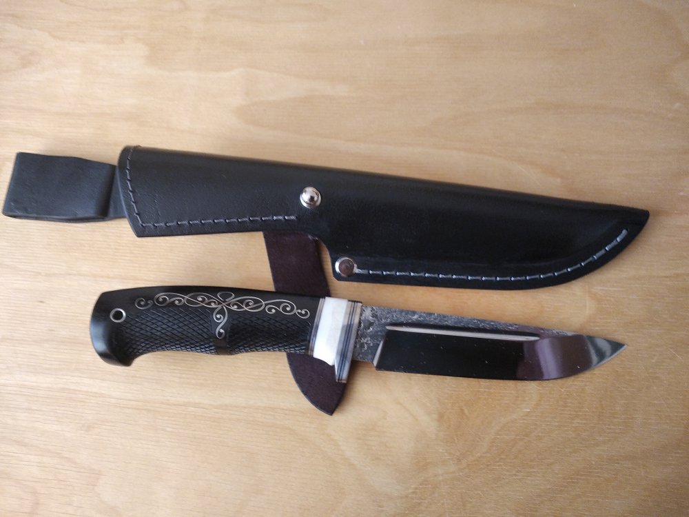 "брюнет", штучный, абсолютно новый, не ХО. размер 230х27х4 мм. клинок кованный (Роман Спорышев)- сталь х12ф1, 115х27х4 мм, твердость 60-62 HRC, рукоять - граб, вставка - бивень моржа, мельхиор, G-10. всечка белый металл, навершие - черный рог буйвола, насечка. монтаж всадной 4х5 на эпоксу. финиш данишойл. ножны деланы по ножу, двуслойные - чепрак и св. кожа. пропитаны воском до "звона". строчка ручная. 17 тыс. руб. тел. 89250273971