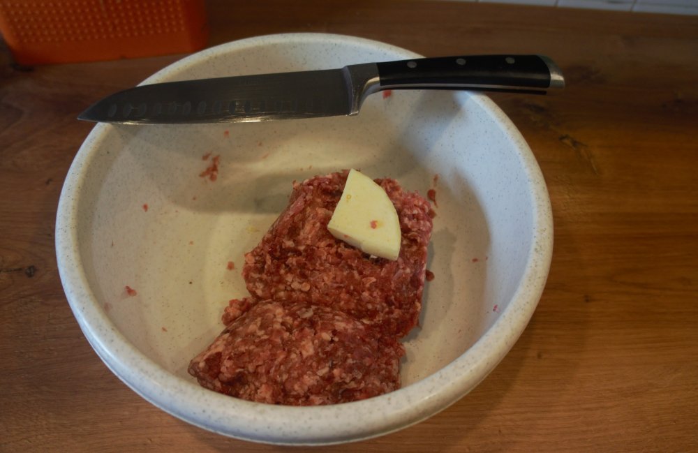 Теперь подробнее. Тот самый «белый кусочек на фарше» - это светлое напоминание о недавно прошедших Новогодних праздниках. А именно- жир, который собирается и безжалостно выбрасывается добрыми хозяйками при изготовлении холодца бессонной ночью с 30 на 31 декабря. Он был спасен, упакован и заморожен. .