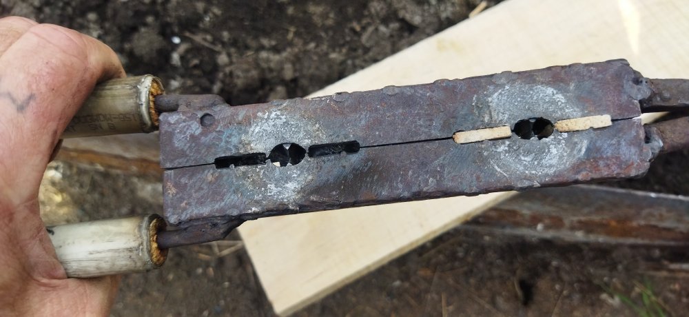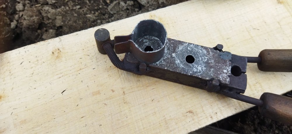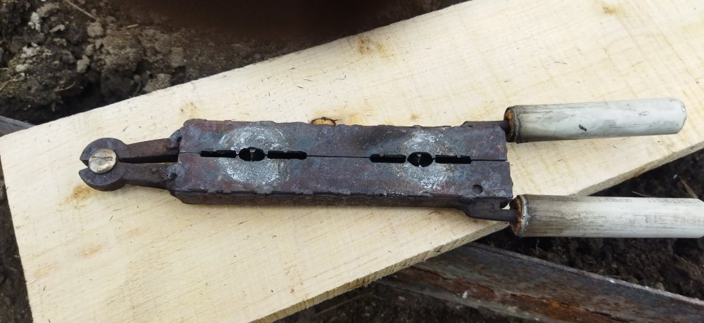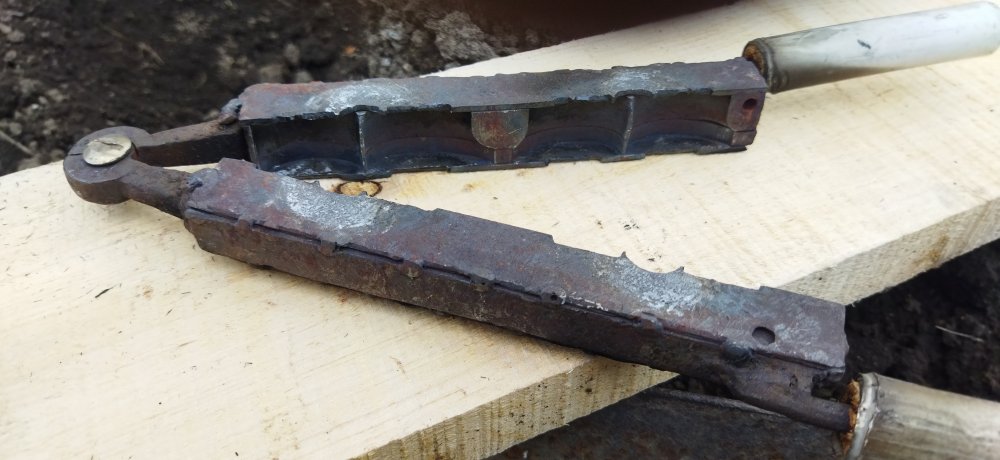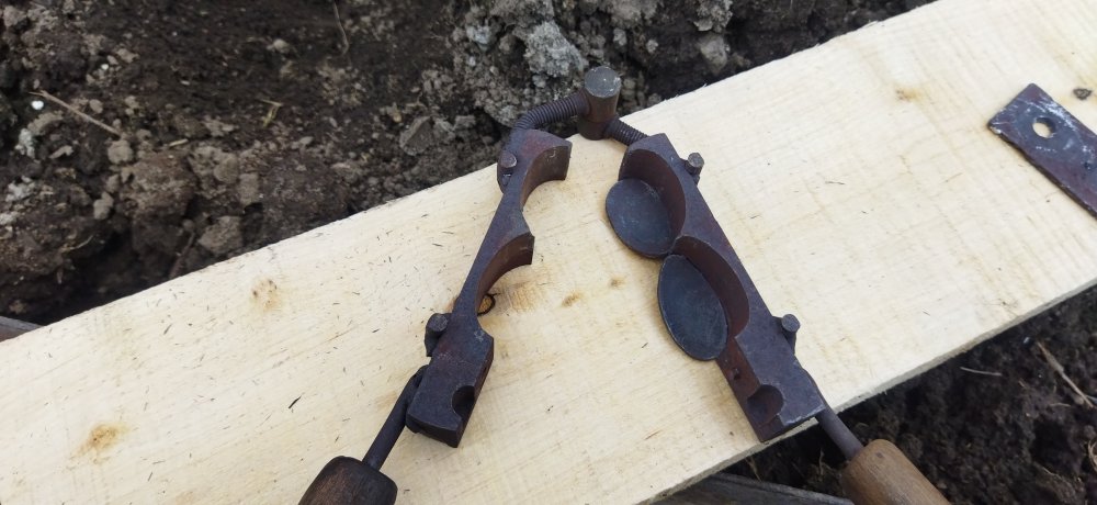 Для тыльников другая.Также из двух стальных полос,попались токарные резцы,отпилил нужное по длине,соединил меж собой на прихватку,сделал выборку по форме тыльников,снизу к одной из половинок прихватиллист.металл нужной мне конфигурации(на одной элементарно применил ложку из нержи подогнанную по контуру). Сверху съёмная пластина из 2йки с отверстиями для литья.Приходится заливать каждую отдельно.Пробовал лить через одно отверстие посередине-херняяяя,по остыванию происходит просадка металла,а по отдельности всё нормално. Принцип литья тот же. ВАЖНО................перед работой формы нужно хорошо прогреть,а после первой проливки они сами хорошо прогреваются и процесс идёт на УРА,только отлетают. Дааа,и ещё............при литье гард нужна или вытяжка хорошая или где то на улице,если позволяют условия.Дыма до еб-фени при сгорании деревях.И деревяхи желательно из осины,самый лучший вариан,. Из берёзы не вздумай,помимо дыма ещё и дёготь выделяется,замучаешься чистить фору. IMG_20210519_165931.jpg IMG_20210519_165941.jpg IMG_20210519_165957.jpg IMG_20210519_170017.jpg IMG_20210519_170028.jpg ..............формы зажимаю в тисках.............слегка..............