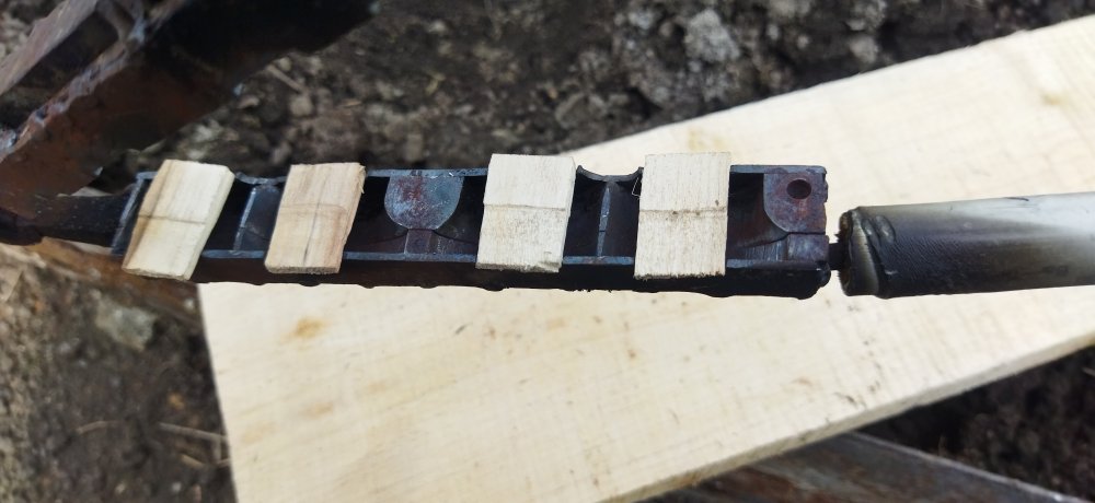 Да не вопрос,никаких секретов.Для литья гард форму сделал сборную,из 10мм и 5мм лист. стали,плюсом из 2йки закрыта сверху и снизу,всё на сварке прихватками.Две идентичные половинки соединены шарниром,сделаны рукоятки изолированные для размыкания формы,чтобы достать готовые безделушки.Деревяшки вставляю,чтобы оставалось технологическое отверстие под хвостовик.У меня здесь 15 мм шир. Важный момент,чтобы дер. вставыш в лицевой части был толщиной меньше толшины хвостовика хотя бы на 1мм. У меня стандартные заготовки из лист. металла толщ.3 мм,так что деревяшки делаю толщ.2мм.При заливке дюрали дер.вкладыш сгорает практически полностью,а отверстие остаётся и уже не надо выЁ....живаться при подгонке ,имею ввиду никаких сверлений и прочего.Дюраль обязателно заливать через литниковый цилиндр из жести,просто в "дырдочку" не зальёшь,не получится. По остыванию прилив нужно отломить,открутить,не дожидайся полного остывания,лучше пока горячий,через минуту-две,потм оооочень трудно. IMG_20210519_170042.jpg IMG_20210519_170100.jpg IMG_20210519_170142.jpg IMG_20210519_170229.jpg IMG_20210519_170233.jpg IMG_20210519_170247.jpg