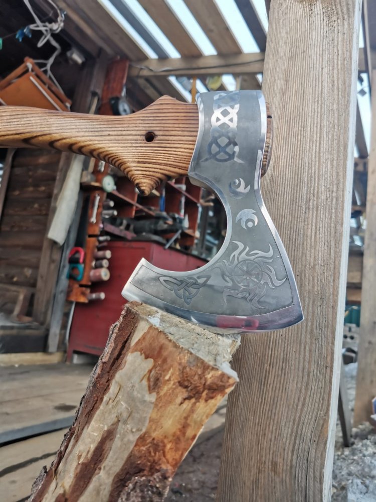 Всем привет! Пишу от имени отца, собственно создателя) Папа на пенсии стал неплохо развивать свое хобби - делает топоры с гравировкой на заказ (остальное тоже по вашим предпочтениям - длина и форма топорища и пр). Они не декоративные, вполне себе боевые. Сделаны из советских обработанных топоров, то есть сталь отличного качества и топор не затупится от втыкания его в пенек. Есть топоры в наличии, их стоимость - 15 000руб. Топоры под заказ изготавливаются в среднем неделю, их стоимость - 19 000руб. Сам гуру находится на стыке Московской и Владимирской области, я могу привозить ближе к Москве (Мытищи, Медведково) Надеюсь, вам понравится ))