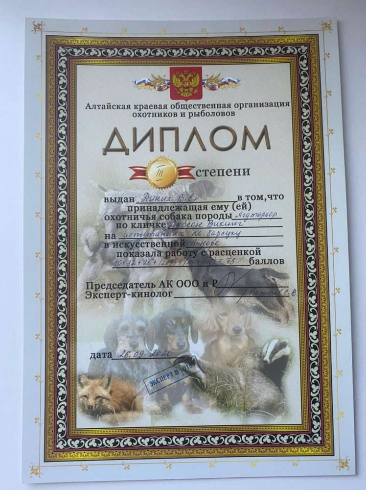 Кобель Акбеон Викинг для племенного использования породы Немецкий Охотничий Терьер. Д.р. 03.02.2019 От: Банзай и Уника Оценка экстерьера - Отлично✅ Дипломы по вольерному барсуку и барсуку в П-образной норе - 1 степени, по лисице в П-образной норе- 2 степени. Своим потомкам передаст отличные рабочие качества, породный темперамент, злобу к зверю Отлично ладит с людьми и очень любит играть с детьми!! Телефон для связи +7 913 020-35-03. Владимир. Цена договорная. Территориально Барнаул.