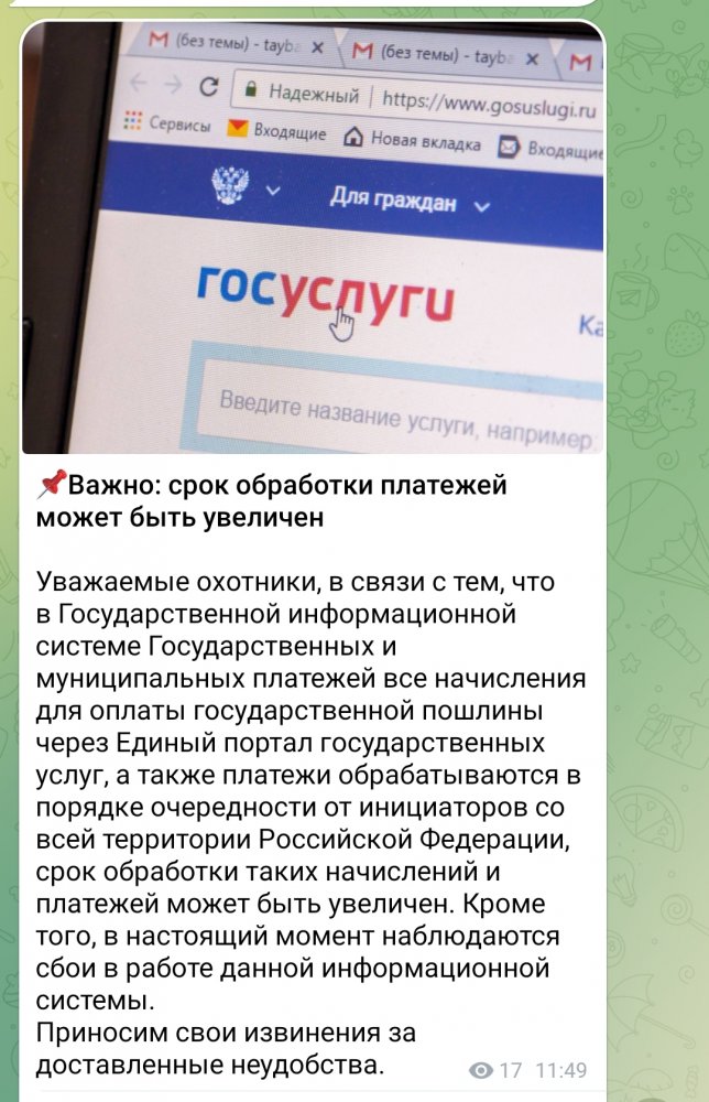Улетел последний гусь на госуслугах;D То пушные появятся, то всё пропадёт. Надо требовать чтобы инспекторы в районах выдавали, как раньше было. Или выдачу через ГУ начинали за 3 месяца а не 3 недели, если не успевают и работает всё через раз.