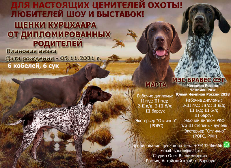 Продолжаем запись на элитных щенков КУРЦХААРА от дипломированных, рабочих родителей. Родились 05.11.2021 г. Остаются не забронированными из помета - 1 кабель и 1 сука. Окрас кофейный. Помогу с доставкой в любой регион РФ. Документы РОРС. Дополнительную информацию, фото, видео сброшу по запросу. Место нахождение щенков г.Барнаул Алтайский край. Телефон: +79132466666; e-mail:saurin@mail.ru