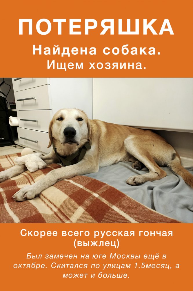 Найдена собака. Скорее всего русская гончая (выжлец) Был замечен на юге Москвы ещё в октябре. Скитался по улицам 1.5 месяца, а то и больше, может, не обращали внимания. Кобель, палевый. Очень добрый, спокойный, но недоверчивый. Не кусается, даёт гладить абсолютно везде. На вид молодой. Из примет: надорвано левое ушко (шрам старый, поэтому, может, на момент пропажи уже был). Очень хочется найти его старых хозяев! Отзовитесь! Если таких нет, то, конечно, нужна новая семья! Собаке нужно будет время на адаптацию, чтобы начать снова доверять. Первое время гулять нужно будет только с поводком. С чипированием, в случае, если найдётся новый хозяин, вопрос решим. Долго держать у себя не сможем, поэтому просим максимальное распространение информации!! Очень не хочется отдавать такого пса на передержки. Контакты: +7 ( 967) 132 03 75 - Марина +7 (906) 038 26 17 - Арина