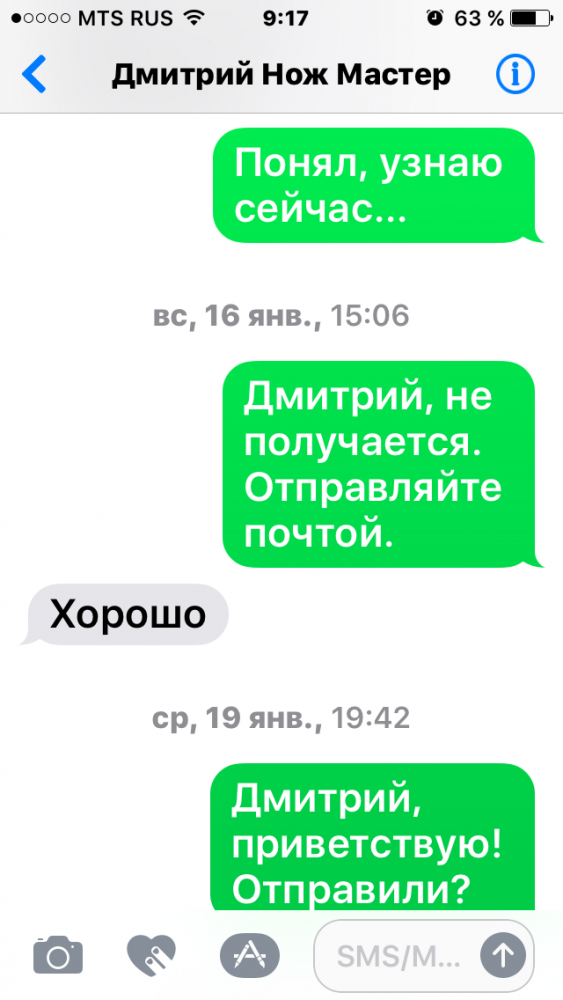 20-го января я ему дозвонился, разговаривал с тем же человеком, что и в начале января, он пообещал мне вернуть деньги и после этого пропал! Со мной вышел на связь человек из другого региона, который отправил ему деньги еще в августе 21-го года. Он его динамил до нового года, как под копирку история с «болезнью», после нового года пропал вообще (хотя со мной в это время общался). 30-го января ему с номера кузнеца позвонил якобы «брат» кузнеца, история та же «кузнец умер», но фотку свидетельства о смерти скинуть отказался. Со слов этого человека голос у этого «брата» тот же, что и у кузнеца! «Брат» пообещал найти готовые ножи и отправить ему один – после этого пропал. Никаких расследований на сайте проводить не собираюсь. Так, для информации заинтересованным… Умер кузнец…! Ничего святого…! Модератора прошу мне скинуть в личку контакты жены, хочется спросить, кто общался со мной с 17-го ноября до 20-го января, и кто принял от меня деньги 15 января…?