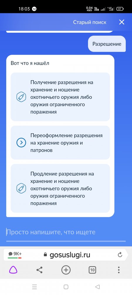 Всем доброго времени суток. Тут появилась неразбериха с подачей заявления через госуслуги. Я сделал вот так. Через браузер зашёл на сайт госуслуг, ввел свой пароль. Далее появилось во такое окно: Screenshot_2022-03-21-18-02-29-97_21da60175e70af211acc4f26191b7a77.jpg потом в поисковой строке набрал Разрешение на добычу. Сайт естественно не нашел нужного варианта, но на обновившейся странице появилось сверху надпись Старый поиск, нажал на него. В появившейся поисковой строке написал Получение разрешения, появилась нужная услуга, нажал ее. Дальше подтверждал личные данные, заполнял заявление. И в конце отправил. Вроде получилось.