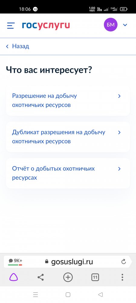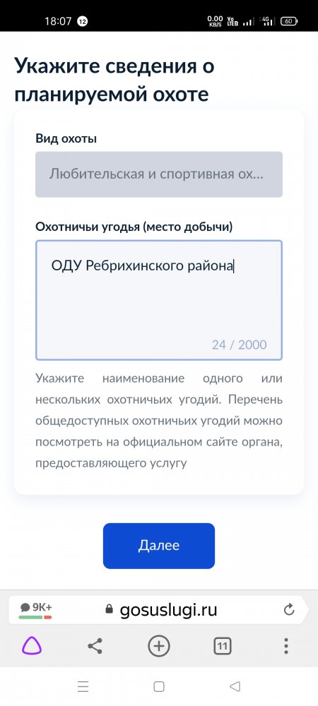 @Василич022, у меня прошло вроде, но не через старое заявление, там немного по-другому: получение разрешения на добычу природных ресурсов в субъекте РФ. Там пишешь район, вид-гуси, норма-3. Заполняешь данные охотбилета. Сегодня оплата пришла 455 со скидкой… как-то так пока<:-(:D