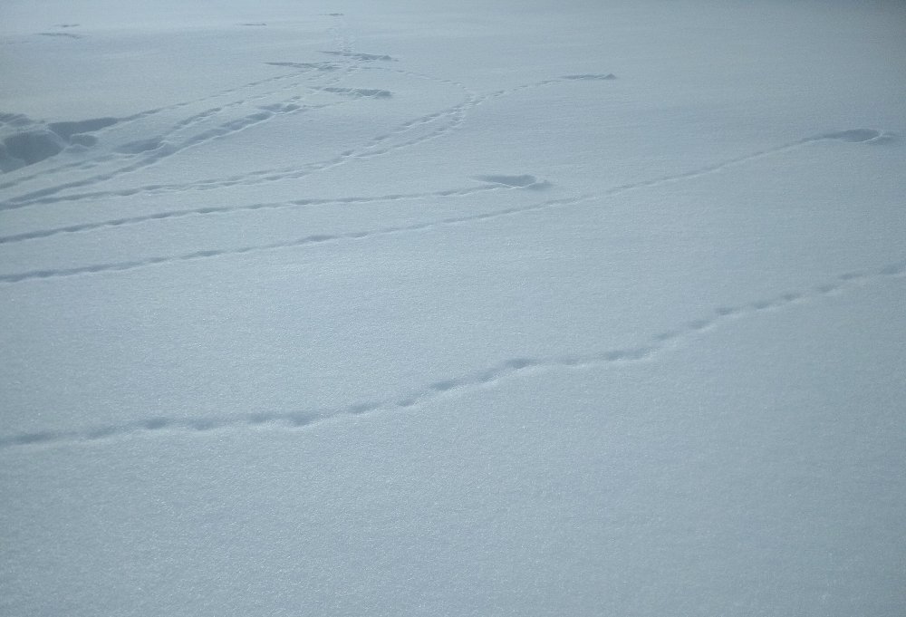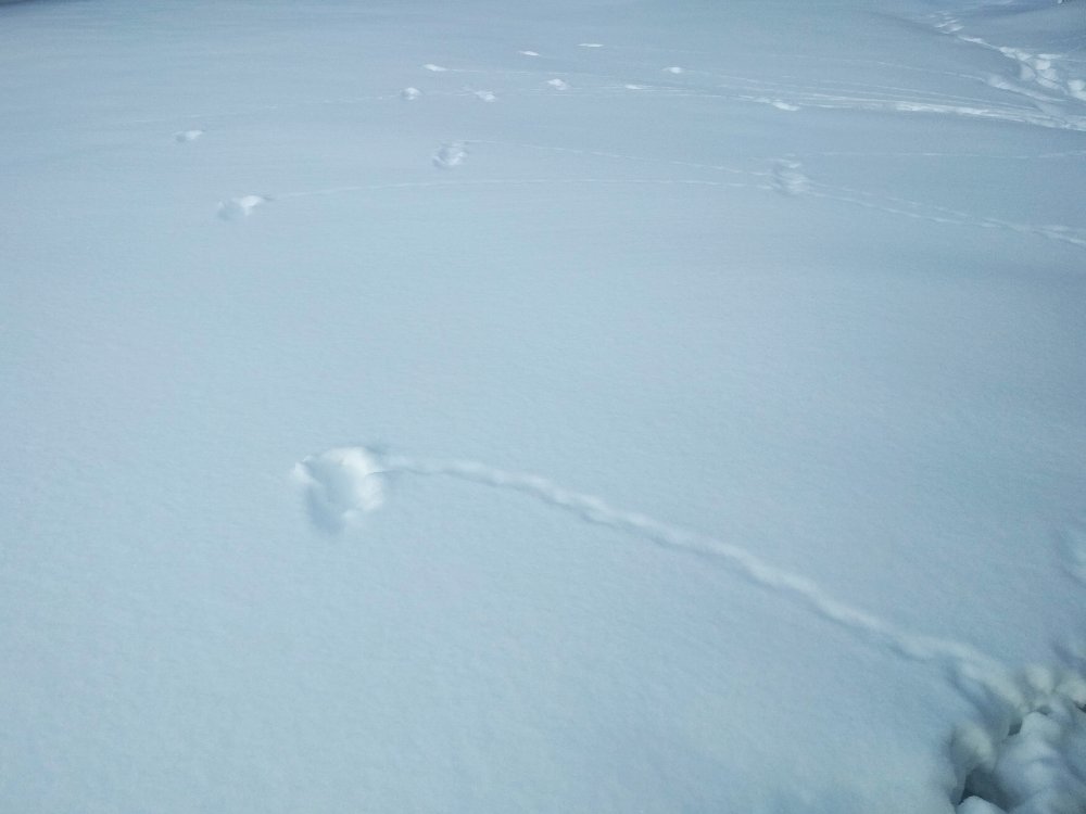 Здравствуйте. подскажите чьи следы на снегу: извилистая дорожка, на окончании которой ямка вглубь снега. наверное птица- после ямки следов нет- возможно перелетела ?