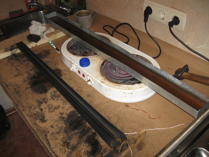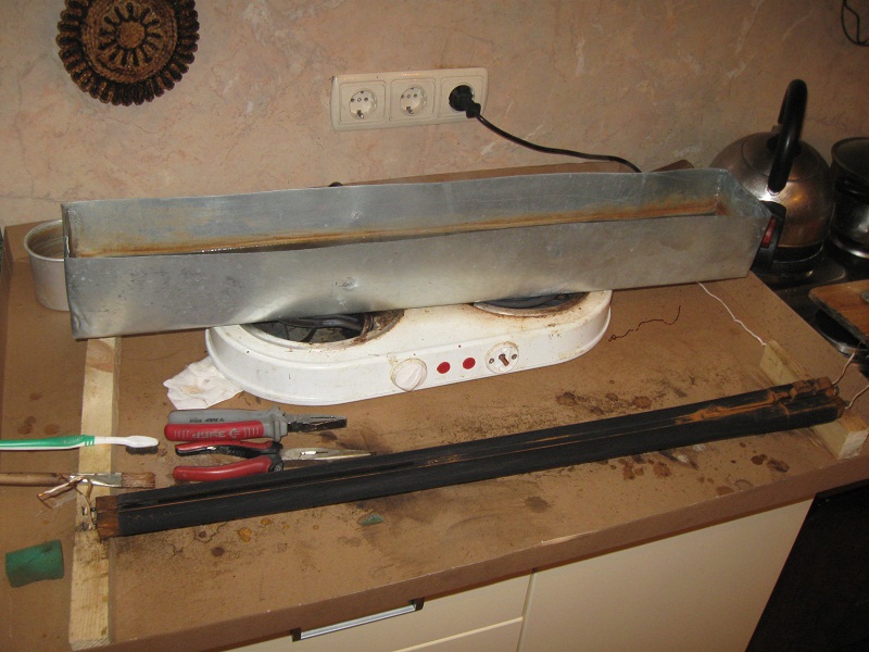 Когда воронил лаком, первую ёмкость сделал из прямоугольной крышки от старого электрощитка. Он по размерам подошёл. Только отверстие под замок заклеил эпоксилином. Для длинных изделий потом сделал прямоугольный лоток из старой жестяной складской полки, толщиной 0,5мм. Выгнул и сварил газом. :)