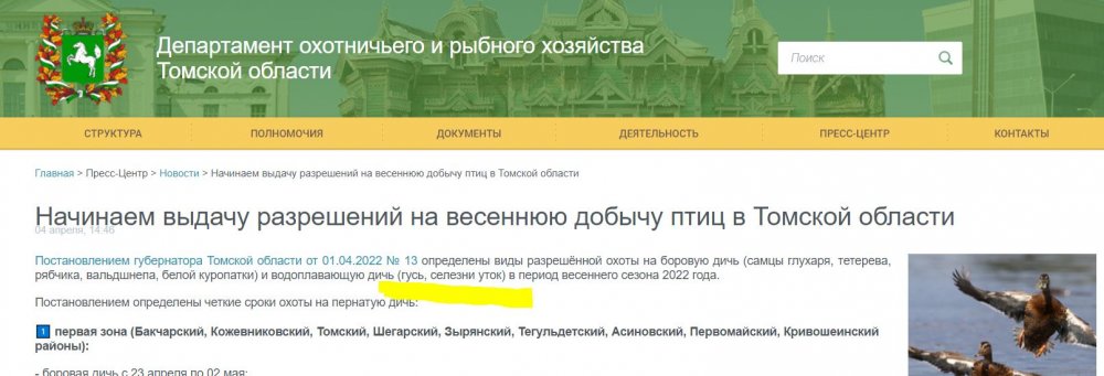 Открытие весенней охоты в Томской области 2022