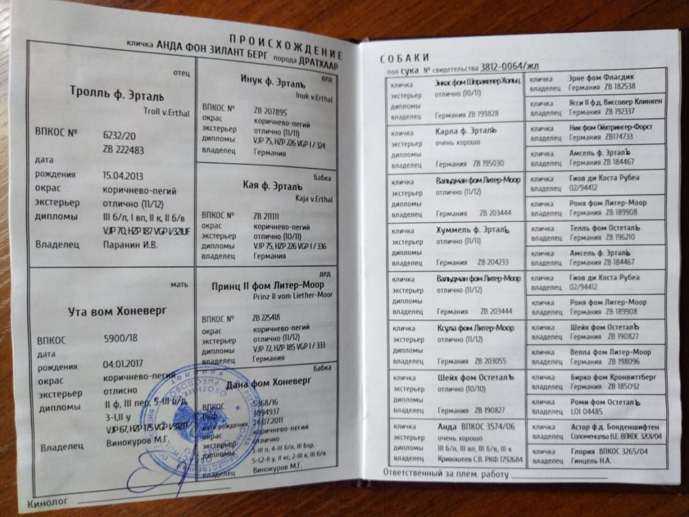 Щенки ДРАТХААРА в Омске Родители превосходных кровей, с отличным экстерьером и крепким костяком, рабочие, активно используются на охоте со стойкой по перу, по утке, по зверю. Родословные РОРС, РКФ. Родились 7 мая 2022 года. В помете 10 щенков. Кобелей – 4, сук – 6. Свободно – 4 кобеля, 4 - суки. Окрас: кобели - 2 коричневых с сединой, 2 коричневых; суки - 2 коричневых с сединой, 4 коричневых. Цена 50000 р. Тел. 8 (913) 152-2545 Виталий Николаевич (г. Омск) Отец: ЛЕСНОЙ ОХОТНИК ДИЗЕЛЬ, владелец Варакин В.Н. г. Омск Кобел импортирован из Казахстана, 07.05.2016 г.р., ВКПОС 5713/18, РКФ 4667183 Оценка экстерьера: отлично. Племенной класс: Первый. Кубок Сибири по водоплавающей птице 2021 год, Омск – ПОЛЕВОЙ ЧЕМПИОН, 1 место в личном зачете, диплом I степени 84 балла. Омские областные состязания по полевой дичи 2018 год – ПОЛЕВОЙ ПОБЕДИТЕЛЬ, 1 место в личном зачете, диплом III степени 67 баллов. Кубок Сибири по полевой дичи 2019, Омск – ПОЛЕВОЙ ПОБЕДИТЕЛЬ, 1 место в личном зачете, диплом III степени 72 балла. Кубок Сибири по полевой дичи 2021, Омск – ПОЛЕВОЙ ПОБЕДИТЕЛЬ, 1 место в личном зачете, диплом III степени 79 баллов. Весенние испытания молодняка VJP 2017 год, Омск – 2 место в личном зачете. Кубок Сибири по боровой дичи 2019, Омск – 3 место в личном зачете, диплом IIIстепени 69 баллов. Рабочие дипломы: По полевой дичи (перепел): II ст. – 1, III ст. – 4. По боровой дичи (тетерев): III ст. – 1. По водоплавающей птице (утка): I ст. – 2, III ст. - 1. По вольерному барсуку: II ст. – 3. По вольерному кабану: III ст. – 3. По кровяному следу: IIIст. – 3. Мать: АНДА ФОН ЗИЛАНТ БЕРГ, владелец Варакин В.Н. г. Омск (от отец: Тролль ф. Эрталь, вл. Паранин И.В., мать: Ута вом Хоневерг, вл. Винокуров М.Г.) 11.02.2020 г.р., ВКПОС 6524/21, РКФ 5892127. Оценка экстерьера: отлично. Юный Чемпион России Чемпион России Весенние Испытания Молодняка (VJP) 2021 год, Омск - 71 балл. Осенние Селекционные Испытания (HZP) 2021 год, Омск – 184 балла. Рабочие дипломы: По полевой дичи (перепел): III ст. – 1. По водоплавающей птице (утка): III ст. – 1. По вольерному барсуку: III ст. – 1. По кровяному следу: IIст. – 1, IIIст. – 1.