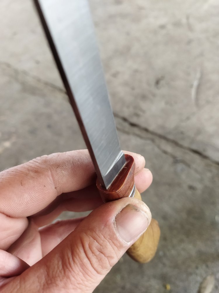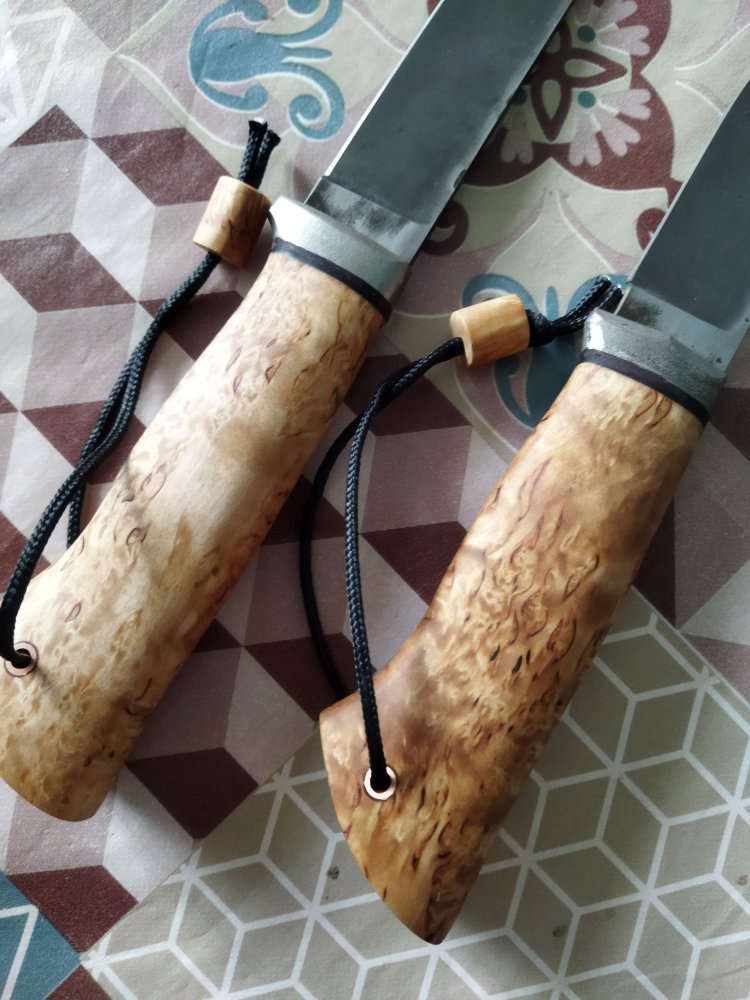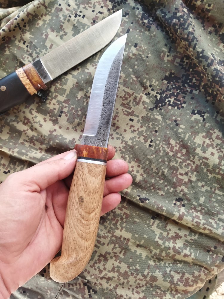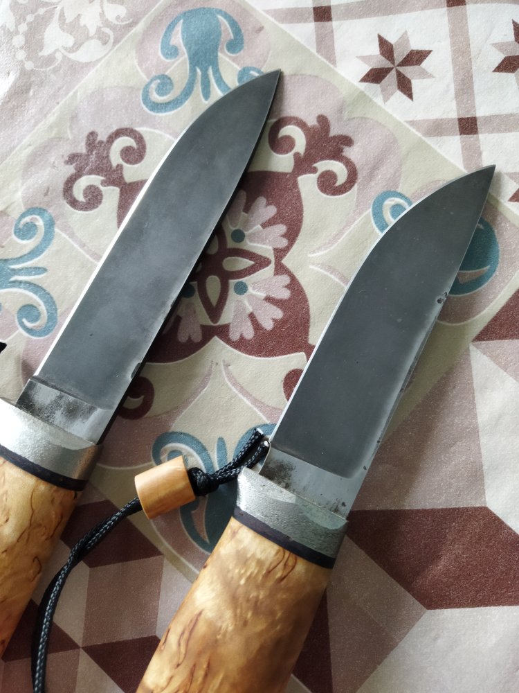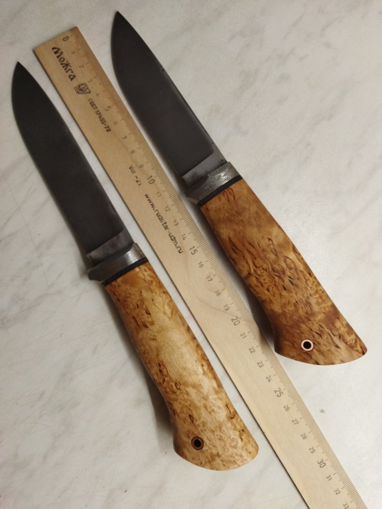 Небольшие ножи, грибнички или разделочные, клинки из немецких ножей от рейсмуса leitz. Длина 140 и 105 мм, ширина 22 и 18 мм, толщина 3 мм, сведены от обуха в 0.2-0.23 мм. Рукояти сувель берёзы и дуба. Цена 1500 и 1200
