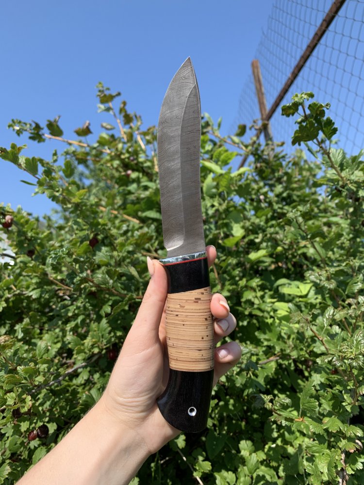 Приветствую всех! Я здесь новенькая, прошу принять меня в вашу дружную форумскую семью! Я рада приветствовать Вас! Мы с моим отцом занимаемся изготовлением профессиональных охотничьих и рыбацких ножей, а также подарочных ножей по задумке автора, и есть мы НЕ копируем модели, а создаём ИНДИВИДУАЛЬНОСТЬ. Клинок: дамаск 800 слоев, длина-142, ширина-30, толщина-3.1 Рукоять: чёрный граб, береста, сквозной монтаж, длина-125 Цена:2800 Наше производство одно из самых выгодных, ведь мы не содержим больших кузниц и производим не целые партии товара, а по одному-два ножа в неделю, зато каких ножа! В них вложена частичка души. Мы находимся в городе Ворсма, Нижегородской области, отправляем по всей России По всем интересующим Вас вопросам звоните/пишите в WhatsApp/Viber/Telegram 89875419253 Валерия в любое время, работаем без выходных, ответим моментально!