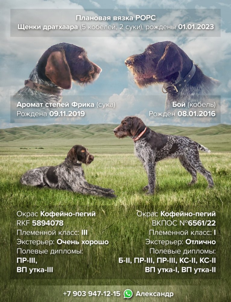 Предлагаются к бронированию щенки Дратхаара. Родились 01.01.2023. Плановая вязка. Документы РОРС. Сука с двойными документами РОРС и РКФ. Родители имеют дипломы по перепелу, по утке, кровяной след. Тщательный подбор генотипа и фенотипа пары . Отличные крови, крепкое физическое здоровье, уравновешенная психика . Собаки активно охотятся, показывают отличные результаты. Щенки поедут к новым хозяевам в марте, при должном воспитании щенка, в августе получиться подружейная собака. Фото, видео по запросу. Только для охотников. При необходимости окажу помощь в воспитании. Цена 30000р. т 8 903 947 1215.