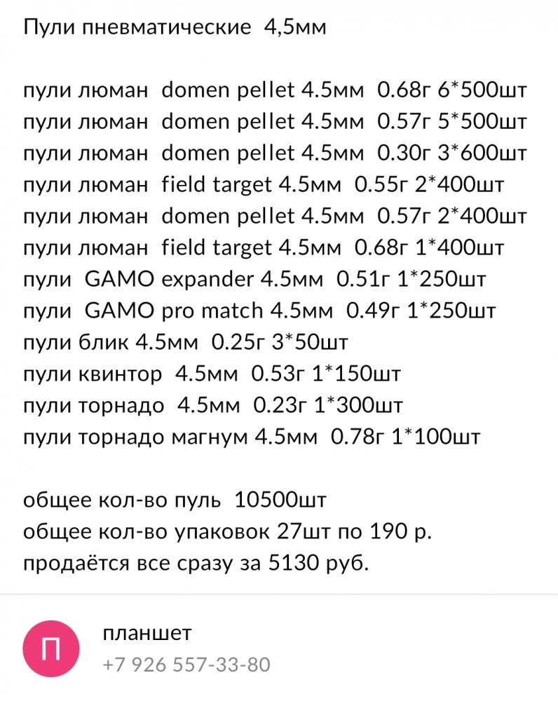 Продам ненужные пульки см. файл. Iynu nHeBMaTeckne 4,5MM nynn ntoman domen pellet 4.5MM 0.68r 6*500uT nynu niomaH domen pellet 4.5MM 0.57r 5*500LT nynu ntoman domen pellet 4.5MM 0.30r 3*600WT nynn ntoMaH field target 4.5MM 0.55r 2*400WT nynu nomau domen pellet 4.5MM 0.57r 2*400WT nynn ntoMau field target 4.5MM 0.68r 1*400WT nynn GAMO expander 4.5MM 0.51r 1*250WT nynu GAMO pro match 4.5MM 0.49r 1*250WT nynn 6nuk 4.5MM 0.25r 3*50WT nynW KBUHTop 4.5MM 0.53r 1*150wT nynu TopHano 4.5MM 0.23r 1*300WT nynu TopHaAO MarHyM 4.5MM 0.78r 1*100WT o6mee KOn-Bo nynb 10500WT oowee Kon-Bo ynaKoBOK 27WT no 190 p. nponaeTCA Bce cpa3Y 3a 5130 py6