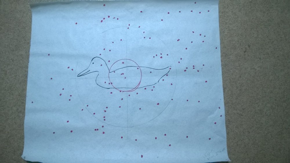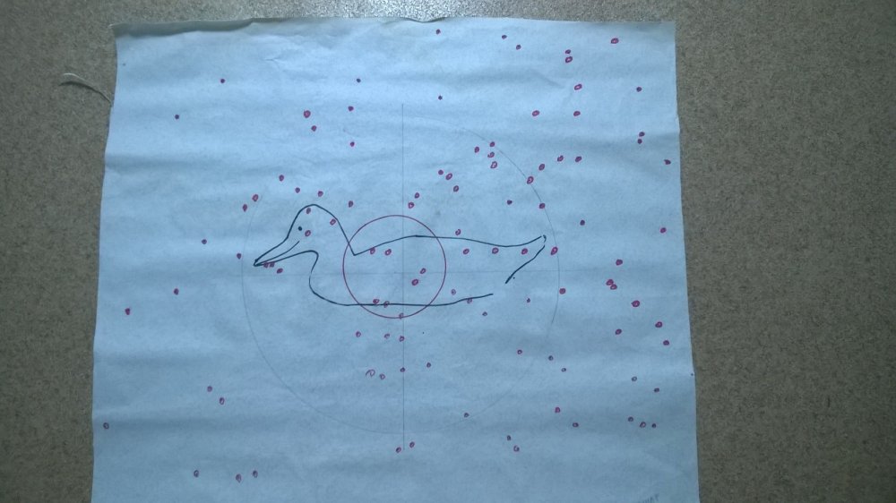 Итак, отстрелял) Сразу оговорюсь, цель -просто посмотреть в общем, никакого подчета и определения кучности, чисто на первый взгляд) Сильно не ругаться)) Мишень- бездольная, "веселая утка", расстояние -35метров при всех выстрелах, отмеривалось рулеткой, патрон самокрут, безконтейнерный. Диаметр круга нарисованного карандашом-40см. Стрельба без упора, стоя. 1. Дробь №5 навеска 32гр. чок
