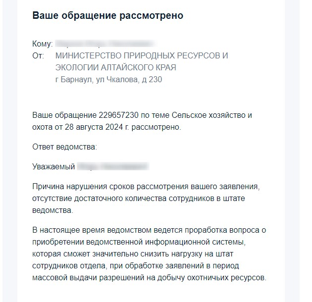 Отпишусь по своей ситуации. Я помимо 21 подал еще одно 23, так как 21 подавал утку и грача в несколько районов подозревал, что что будет такая ситуация и подал еще просто утку. В итоге 28-го написал жалобу на нарушение сроков, 5 - го октября мне пришел ответ ваше обращение рассмотрено, ответ вам направлен в личный кабинет госуслуг, а ответа нет, ну я подождал пару часов и вернул им мол ответ то где. На поданное 23 все прошло тоже не вовремя, 2 октября только оплату выставили, оплатил и 6-го поехал забирать только утку. Пока стоял Олеся по телефону с кем то похоже про меня разговаривала, мол типа он не понимает что оно позже придёт и назад вернул, поржал немного но промолчал. В этот же день приходит ответ в ваш личный кабинет госуслуг направлен ответ ведомства, для удобства дублируем его сюда. Тут я вообще удивился, я из госуслуг смотрю и в упор не вижу отдельного ответа, только прикрепленный файл к этому сообщению. В ответе пункт 17.11 типа мест несколько и разные сроки и все. Ну опять написал типа вы там читаете или нет, я жалуюсь на то что срок оказания услуги нарушен и назад отправил и вот уже 11 дней тишина в ответ, подозреваю ответа не будет. По сути получается я жалуюсь и они сами рассматривают эту жалобу, это какой то маразм, видимо надо это все собирать в кучу и писать в прокуратуру.