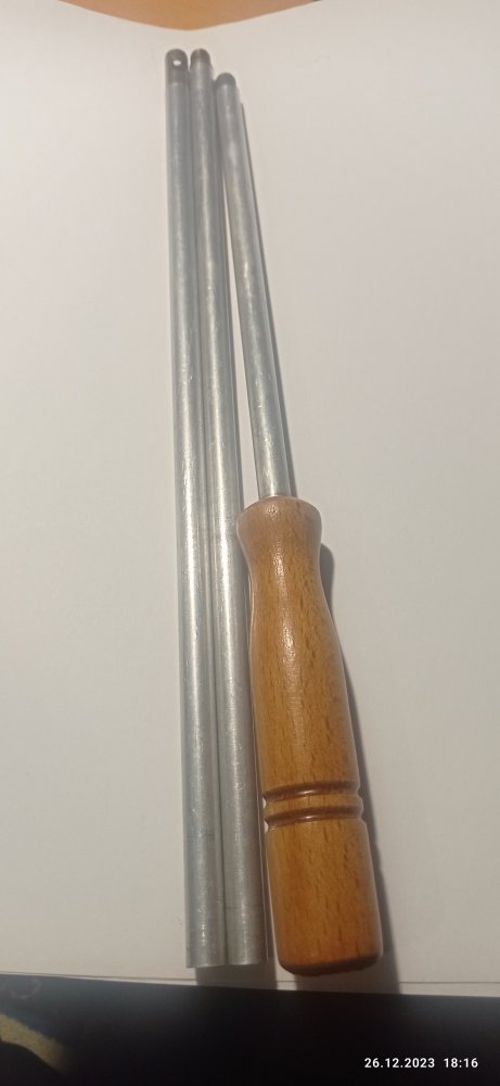 длина в сборе 650 мм без рукояти, материал - алюминиевая трубка диаметр 8,2 мм, заводского изготовления рукоять из дерева, цена 650 руб. 8-953-769-05-05