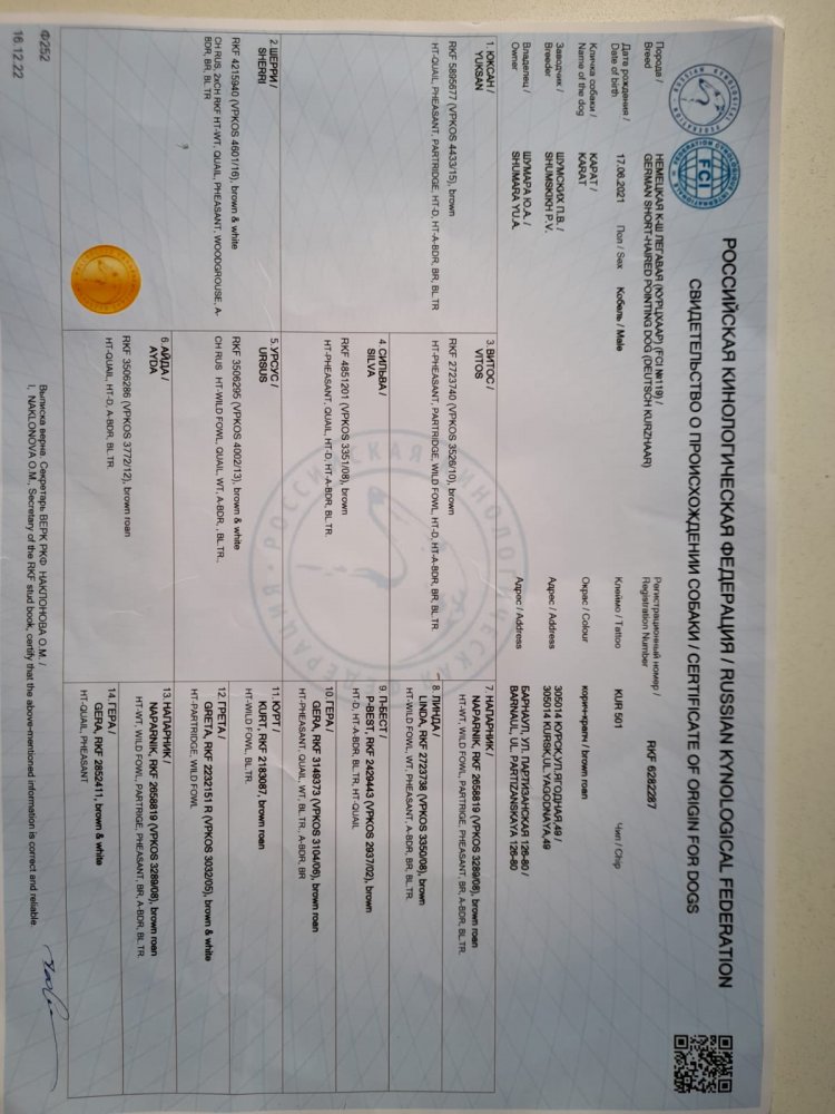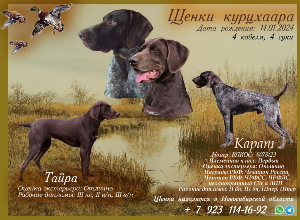 Поправлю текст объявления, надеюсь заводчик на меня не обидется. 14.01.204 Родились щенки от плановой вязки курцхааров. Документы РОРС. отец Карат, ВПКОС № 6078/23, Шумара Ю.А., отлично, 2-III п, III вп (г. Барнаул) мать Тайра, Попов В.Ю., отлично, III кс, II, III вп. в помете 8 щенков 4 кобеля и 4 суки. Щенки находятся в городе Новосибирске. Отец щенков Карат, 6078/23. Мать щенков Тайра.