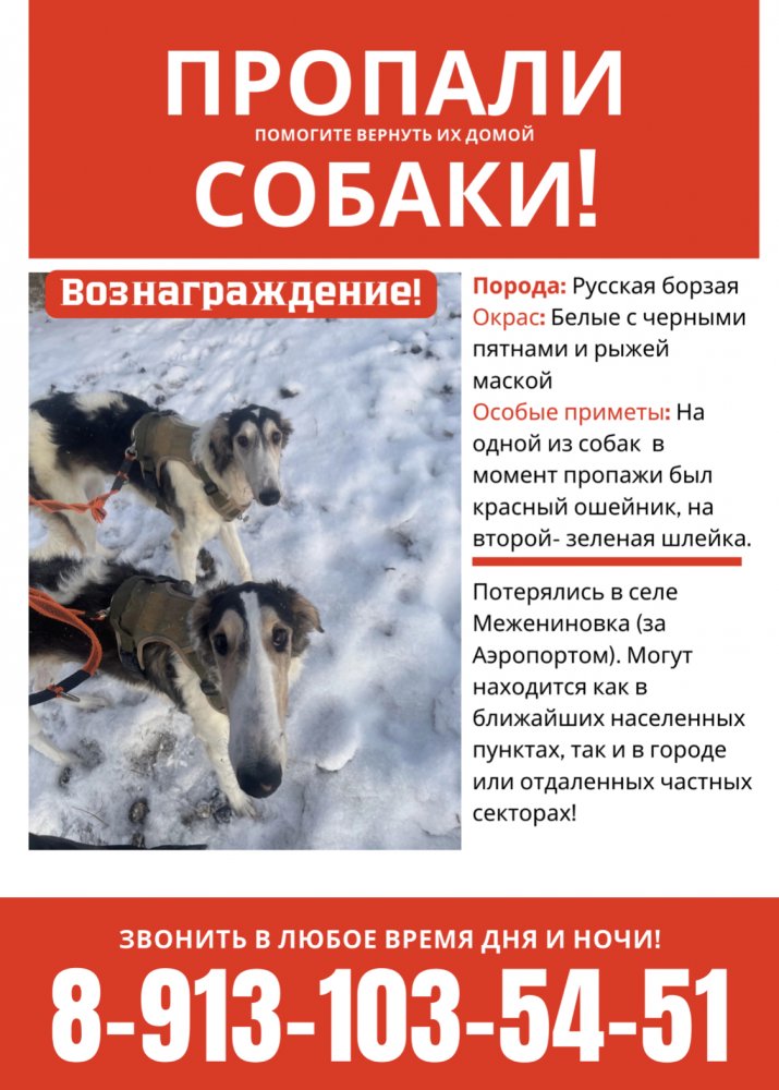 21.03.2024 с с.Межениновка Томской области ушли с поля два щенка-подростка русской псовой борзой. Первые два дня были свидетельства, по которым искали собак- но не нашли. Сейчас же тишина, как сквозь землю провалились… Есть вероятность что кто то поймал и решил приватизировать собак! Возможно их скрывают… Если вдруг кто что видел, слышал, пожалуйста, сообщите! Так же есть вероятность что собаки бегают в ближайших от села полях/лесах… за достоверную информацию ВОЗНАГРАЖДЕНИЕ! Так же как и за возврат собак домой… тел.8-913-103-54-51