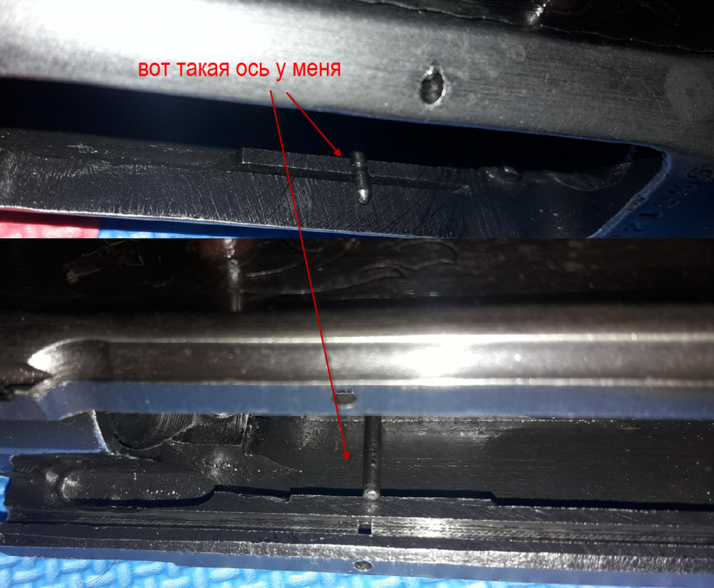 Если у вас было бы также, можно было бы не пилить защелку, но, полагаю, она была длиньше в верхнем "хвостике", упиралась в выступ затвора (у меня еще и курку мешает эта защелка и есть один интересный дефект: чтобы спустить затвор с задержки, сначала легко нажимаешь на кнопку, подаватель чуть поднимается вверх, а уже сильнее нажмешь, затвор срывается - настолько из отбросов сделали, сравнивал с защелкой друга - у меня "мяса" чуть снизу не хватает, буквально 1мм, мож подварю когда) даже, когда его стебель лежал на рычаге подавателя, а остов смещался вперед, и ее пришлось срезать, ведь выступ на затворе у вас длиньше и начинается дальше моего (см. рисунок). Выступ останова вам пришлось сместить (легко видно по рисунку, что старый выступ оставить нельзя, иначе сильно придется сдвигать ствол с затвором вперед, а некуда), а форма закругленная, скорее всего больше понравилась с точки зрения износа.