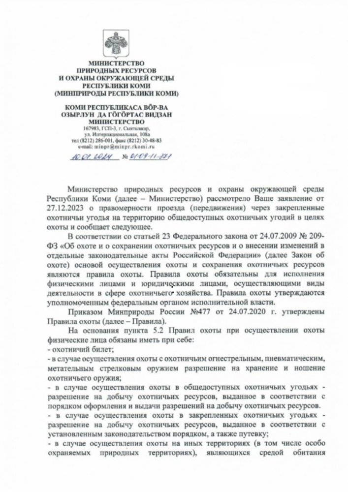 Часть 3. Ответ руководителя охотдепартамента Коми. Приравнивание не правомерно. У охотника была транспортировка, на которую он имел право, оружие зачехлено, признаков осуществления охоты при следовании транзитом через другие угодья не было. В обосновании идет ссылка на Конституционный Суд РФ. В итоге: признание факта, что были нарушены права охотника и он имеет право на обращение в суд. Звучит издевательски (права нарушены самим департаментом и в суде он был). И ни слова об ответственности должностных лиц из департамента нарушивших его права. Обжаловал ли охотник решение суда мне не известно. Срок был пропущен. Это легко писать, а живя в глубинке сельчанину обжаловать решение в вышестоящий суд не так просто. Проще заплатить штраф и послать всех ... И не удивлюсь, что даже после всего этого инспекция штампует на этой же дороге протоколы и далее. Суд ведь признает их. Проблема здесь не только в недостатках закона и даже не столько. Правовая база есть, она никогда не будет абсолютно совершенной. Охотник дело имеет с властной системой, что он в одиночку может ей противопоставить? Или у охотников появятся свои общественные организации, которые будут защищать интересы законопослушных охотников, в том числе, и юридическим способом, либо любительскую охоту очень быстро сожрут (она не интересна ни властям ни кошелькам). Но это уже другая тема.