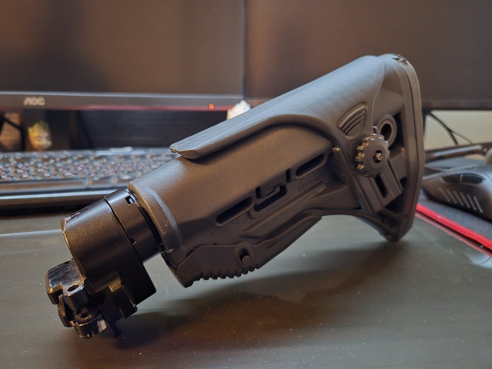 Продам комплект: Приклад FabDefense GL-Shосk (копия) с компенсатором отдачи и регулируемой щекой. Труба металлическая 6-позиционная резьбовая стандарта мил-спек. Контргайка для фиксации трубы, стальная. Адаптер-переходник приклада "Фронтлайн" от Лейком (L.A.C.), цельнофрезерованный, стальной, отличного качества. Подходит для всех карабинов ВПО со складывающимся влево прикладом. Имеет полную совместимость с блокиратором ВПО. Совместим с защелкой от стандартного приклада. Переходник с завышением, т. е. ось направляющей трубы поднята к оси ствола, позволяет ощутимо уменьшить влияние подброса ствола при выстреле и улучшает общую развесовку. Удобен при стрельбе с использованием коллиматорного, либо оптического прицела. Комплект стоял на Вепрь-1В .308 win (ВПО-127), см. фото. 15 000 руб. м.т. +7-95З-777-6ЗЗ9