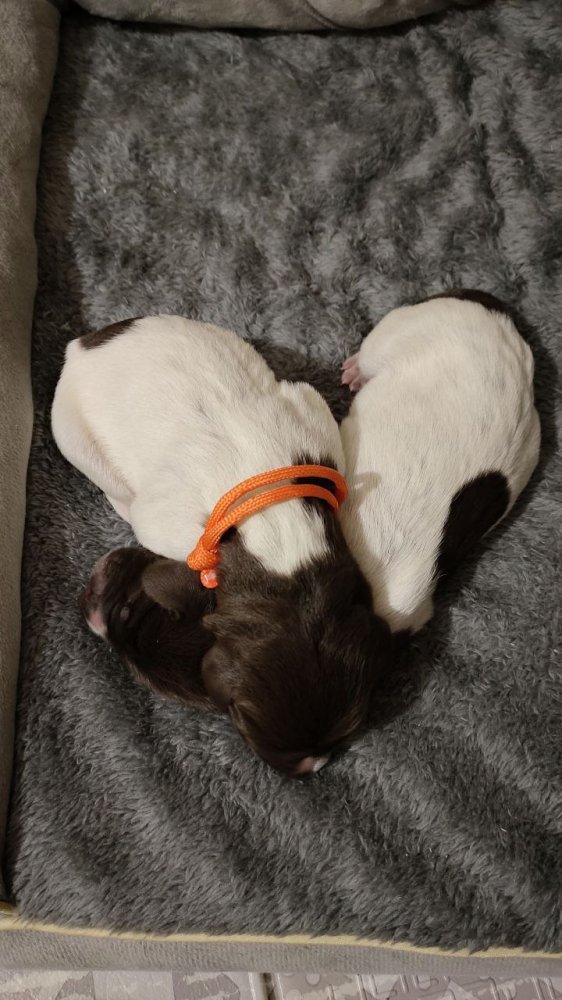 Свободна: кофейная сука. Совершенно очаровательная особа. Не из робкого десятка. Упёртая, точно знает чего хочет, пробивная. При этом вообще не истеричная, всё молча. Активная, любознательная. Станет замечательным партнёром в охоте. Нарядные носочки со временем, скорее всего перестанут быть сплошными, но пигмент останется. Есть крап на грудке, чуть - на задних лапках, и сердечко на пузе (как у мамы).