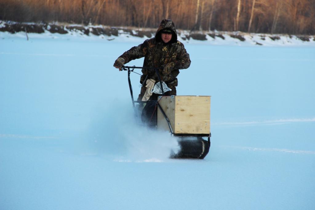 По такому снегу да ещё ровная поверхность без проблем пойдёт. Я для охоты брал - пахота, согры и т.д. В нэте о ладоге нет ничего, вот я и хапнул счастья. Каток я не ломал. Он просто слетел. У бурановского две крышки и болты а у этого подшипник вставлен и зафиксирован пружинной шайбой, а канавку проточить под шайбу "забыли". Я удивляюсь как оно так долго отходило и не слетало!!! На других колёсах канавки есть, надо на всех проверить чтоб не ходить колёса не искать по полю :-))) . Тяги и тросик пролил "унисьмой", она на основе керосина (типа WD-40). Пробег у моей тоже часов 10-12. Сегодня после работы немного поездил по пухляку. Потеплело, снег очень тяжелый, наст не держит и в то-же время нифига не пухляк - плотный, тяжёлый и липкий. Морду нагрузил килограммов 25 примерно. У меня ящик так-же стоит на платформе. Если снег выше колена и ящик упирается в снег собака не едет. Приходится протаптывать или лопатой работать. Разговаривал с мужиком у которого был рэкс(хонда 9 сил, автомат, гусеница 500 мм.). Он говорит что ездил везде без проблем 3 зимы, эксплуатировал ежедневно(по 3 цепи за зиму укатывал), пёр он в любой снег(если снега много шёл как подлодка) и в любую гору. После продал мужику в Камень. Тот тоже доволен. Ездят в 4 хари по 120 кг. на рыбалку. Вот я и думаю, может надо было для охоты брать с автоматом а не с вариатором? Вариатор выдаёт скорость только на укатаной дороге а по полю всё равно быстро не едет.