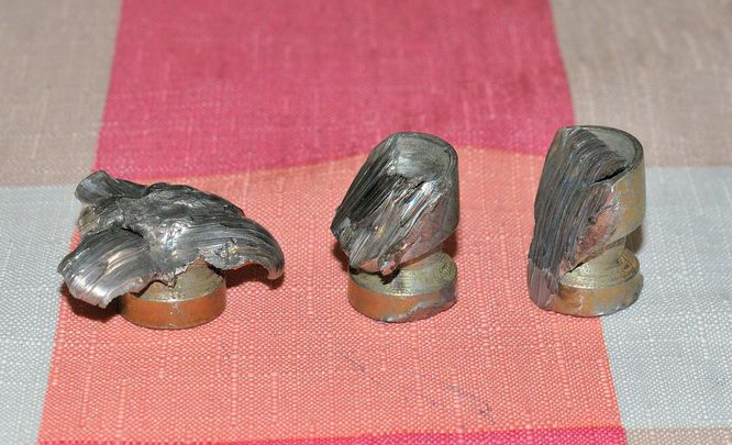 RW1AW ' 16 июн 2012 КЛАССНАЯ ПУЛЯ, СПИ. СПАСИБО Михаилу Юрьевичу! СПИ дает КЛАССНУЮ кучу и в 12м калибре. Лучший результат, полученный сегодня ( в сериях из 5и выстрелов ) из гладкого короткого ствола 51см цилиндр )Benelli Rafaello Comfort, без оптики, только коллиматор EOTech 552 : 25x21мм по центрам пулевых пробоин. ( все пробоины - в десятке спортивной мишени ?4 ) Больше радует стабильность выстрелов, а значит и патронов.Многие самокрутчики замечали, что при снаряжении патронов свинцовыми пулями....с увеличением навесок...пули начинает разбрасывать ( и не только легкие! ) При стандарте (не магнум навесках ) все (точнее, примерно все, для стрельбы в тире ) устраивает, но особенности такой пули на охоте заставляют стрелять исключительно снайперски - только по месту ( поэтому и....много подранков...у некоторых охотников Это естественно, одна из причин - свинец плывет при хорошем разгоне уже в канале ствола. С СПИ все в точности до наоборот - с разгоном пули увеличивается ее устойчивость и естественно энергетика - посмотрите внимательно еще раз на снимок трех СПИ ПРИ ВСТРЕЧЕ С ЦЕЛЬЮ ПОД РАЗНЫМИ УГЛАМИ ( ВТОРУЮ И ТРЕТЬЮ ПУЛИ, СРЕЗАННЫЕ по диагонали под углом 45 и 60 градусов - при этом правая часть пули по осевой практически не деформирована....пуля при встрече с такой целью ( срез ОЧЕНЬ прочной стальной плиты )...стремится продолжить прямолинейный полет...ее не кладет на бочек...иначе бы ВСЯ боковая часть пули была бы не срезана...а просто расплющена при такой дури - это наглядно показывает первая пуля при фронтально лобовом попадании в прочную стальную плиту... и ЭТУ пулю не уводит на рикошет. И это не при стрельбе в упор, а на нашей рабочей охотничей дистанции 50м ( по той же причине СПИ штробит мерзлую чапыгу, кустарник и т.п не отклоняясь от своей траектории...и приходит в цель не "теряя лица" RW1AW ' 16 июн 2012 Это здорово Михаил Юрьевич, что Вы делаете сейчас НАРОДНЫЙ ПАТРОН НА СПИ: ( СПИ + ПРОБКА + СУНАР )... .. фото, что происходит с СПИ, когда она разогнана до скорости порядка 570-580м/cек в 12калибре...пули извлечены из пулеулавливателя за мишенями на рубеже 50м RW1AW » 19 июн 2012, 21:28 Дождусь эаказанный, второй - правильный хрон / такой же, как брал в Воронеже у ... для тестов Сергей - Mefistofel ; / , отправлю серии в 12м и 20к на бал.ствол...еще постреляю не только на импорте, а и на нашем Сунаре...патроны для 12 и 20 калибров с Сунаром готовы...попробуем и на Рексе...да и варианты самой пули в 20калибре ...тоже в работе. ( надеюсь другие коллеги тоже отстреляются т.к тема, похоже, зацепила многих...и выложат здесь свои результаты с описанием процесса ). Поскольку сайт действительно дружественный и стиль общения здорово отличается от ганзейского ( здесь в основном общаются единомышленники ) не хочется никого вводить в "заблуждения" цифровыми результатами тестов и потом посыпать голову пеплом в случае ошибок.. Ценю чужое время ( и свое тоже ) Поэтому предолжение проверки воспринято правильно - продолжение т.н отчетов...будет ( скорее всего, в сентябре-октябре.) Планов много...процесс проанализирован и даже расписан. Поэтому не буду от него отвлекаться - дел ... по гланды. "Патрон похожего снаряжения (там 92-го было даже чуть больше - 2,85г) был отстрелян на балстволе. V10 там составила чуть более 500 м/с. Если достоверны обе цифры, то потеря скорости на первых 10-ти м в 13,7% - это фигово." Вот только нельзя сравнивать....патроны "похожего" снаряжения и с