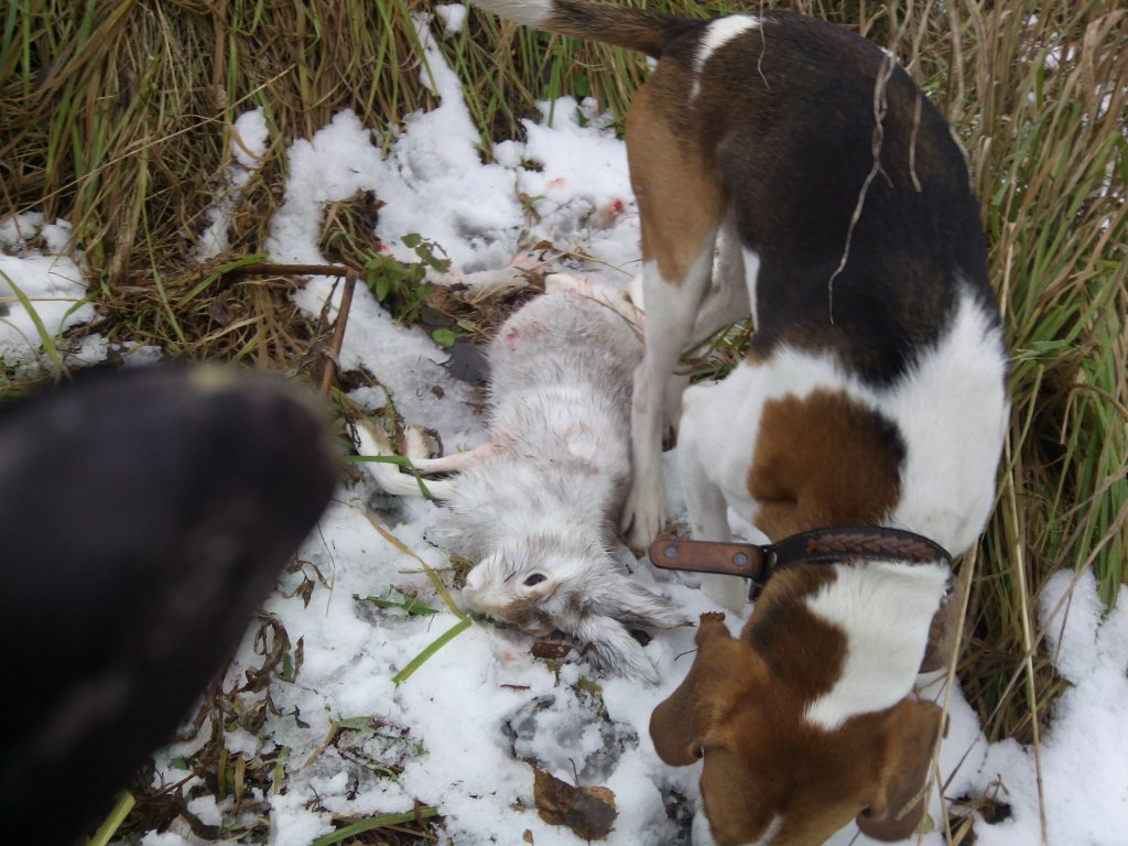 Выехали в первые после потери с Громовной в двоём,старшую оставил дома!!!Через 10мин отдача голоса,вижу с противоположной стороны лога зайца на подъёме из лога и вот она зазвенела,на первом круге пропустил прошёл в 100метрах :-\ жду снова не слышно совсем ветер забивает и навигацию ещё дома оставил(забыл),но не много погодя он у ног,быстро прошла сегодня охота!!!Всем удачи!! :crazy: :crazy: :crazy: