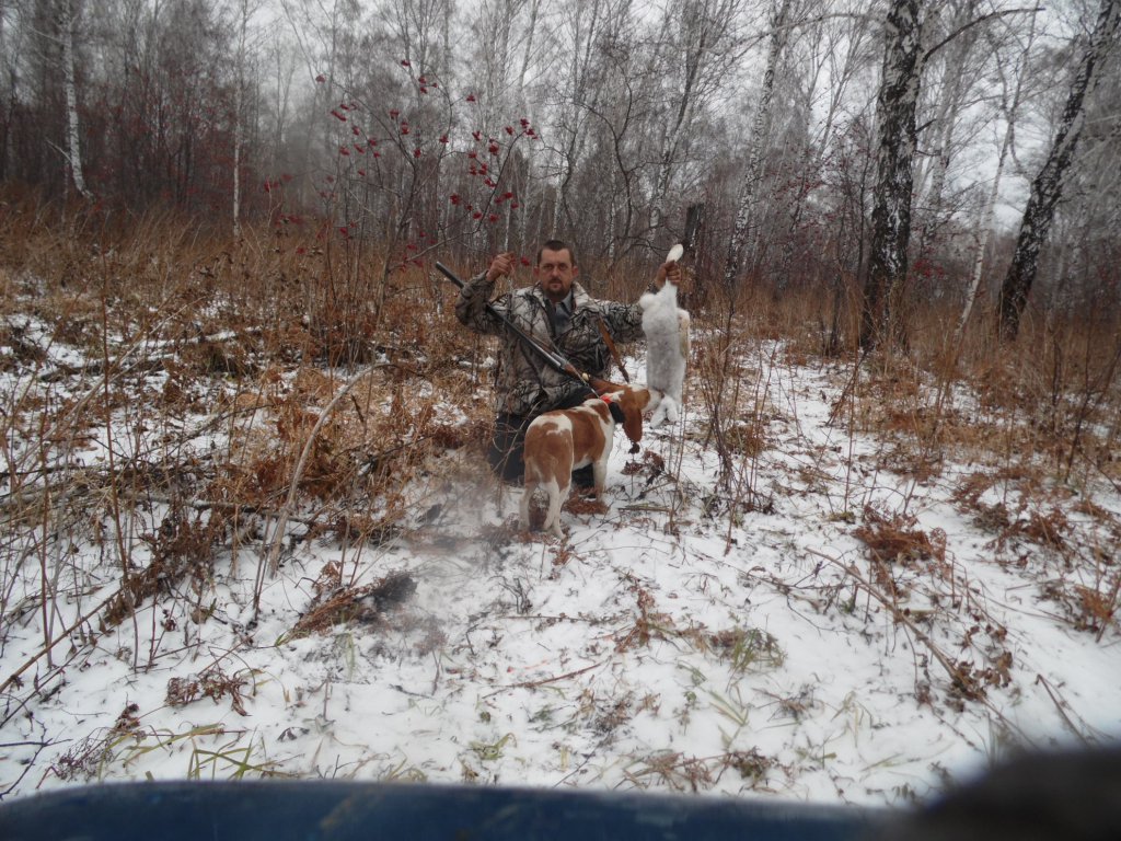 После 4 дневного отдыха мы выехали в 9-00Думал,что сегодня толку не будет.Прибыли на место выпустил собак,пока расчехлялся и вел переговоры с егерем собаки взревели,проходит 6-8мин не больше и зай проходит в 10мет от нас,расстались с егерем и пошёл встал на след.Ещё 15мин гона и он снова вышел в лобовуюСегодня сработали без добора отлично!!Всем удачи