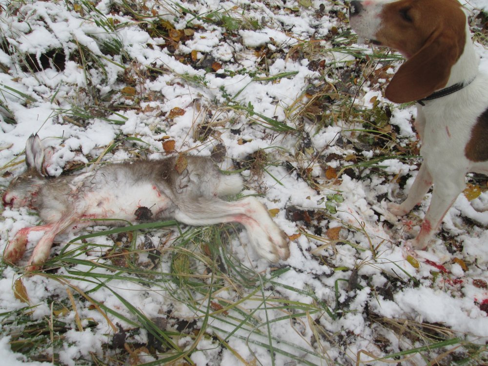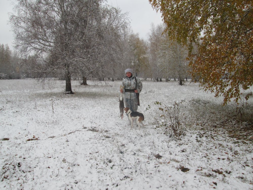У нас тоже пошёл прогресс сегодня говорушка познакомилась со степашкой. Мажор поднял гонял минут 40 два раза перевидел но в момент когда косой проходил лаз Говорушка кудато исчезала пока дозвался след видимо немножко приостывал и она некак не могла понять что от неё хотят. Стрельнул хотел подранить но положил чисто Говорушка сперва обнюхала апотом взялась трепать дал в досталь на трепать пришёл Мажорка и у них получился не большой конфликт, но я их быстренько померил уложив косого в котомку;). после знакомства Говорушка стала активно проявлять интерес к следам. Завтра снова в лес интересно получится ли их сгонять в смычёк
