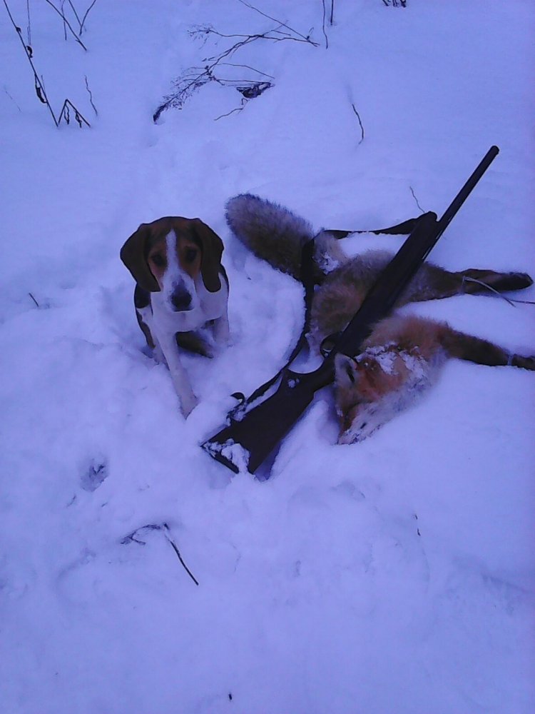 Вчера Говорушка немножко прогнола потрегевну гон был метров 250- 300 лиса вышла прямо на меня отпускать не стал взял. После выстрела подошла по следу немножко потрепала после того как забрал лису и уложил в рюкзак снова ушла в этот же мелкач кстате очень густой минут через пятнадцать-двадцать помкнула зайку гоняла минут 25-30 сама выправляла все сколы два раза перевидел, потом окончательно скололась на сколе была минут двадцать, пока я продерался по не проходимому чащёбнику ушла со скола комне, взял на поводок и к машине поехали домой.:good::O