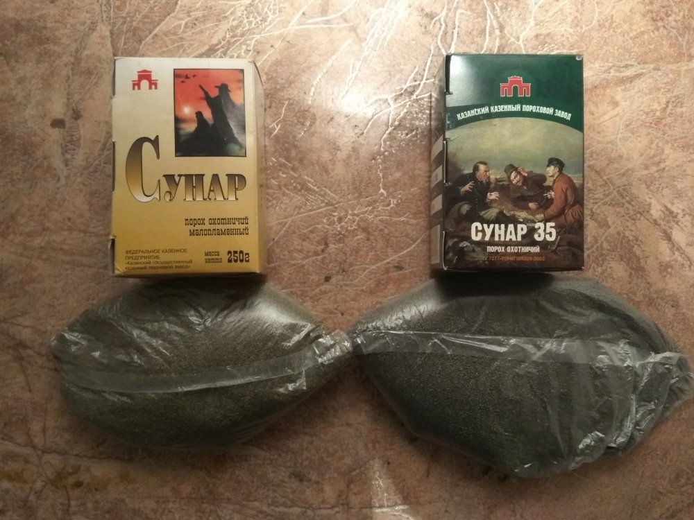 Привет, Товарищи! Купил Сунар-35, в зеленой пачке, 250 грамм. Порох серого цвета. Стреляет достаточно кучно и резко, в 16 калибре. Как в пластиковой, так и в металлической гильзе. При выстреле из последней ствол чистый. Стрелял при температуре -12 градусов. Центробой прекрасно поджигает данный сунарчеГ. Кучность регулировал подсыпкой в дробь манной крупы (-1 грамм дроби, +1 грамм манки). Пороховая прокладка- 2*1,5 мм *плотнососкрипомзаходящаявгильзу*, 3 пыжа, вырубленные из плотной китайской стельки. Затычка- разрезаная накрест надкалиберная 8 мм-пробковая, и залитая канифолью. Сунар.jpg