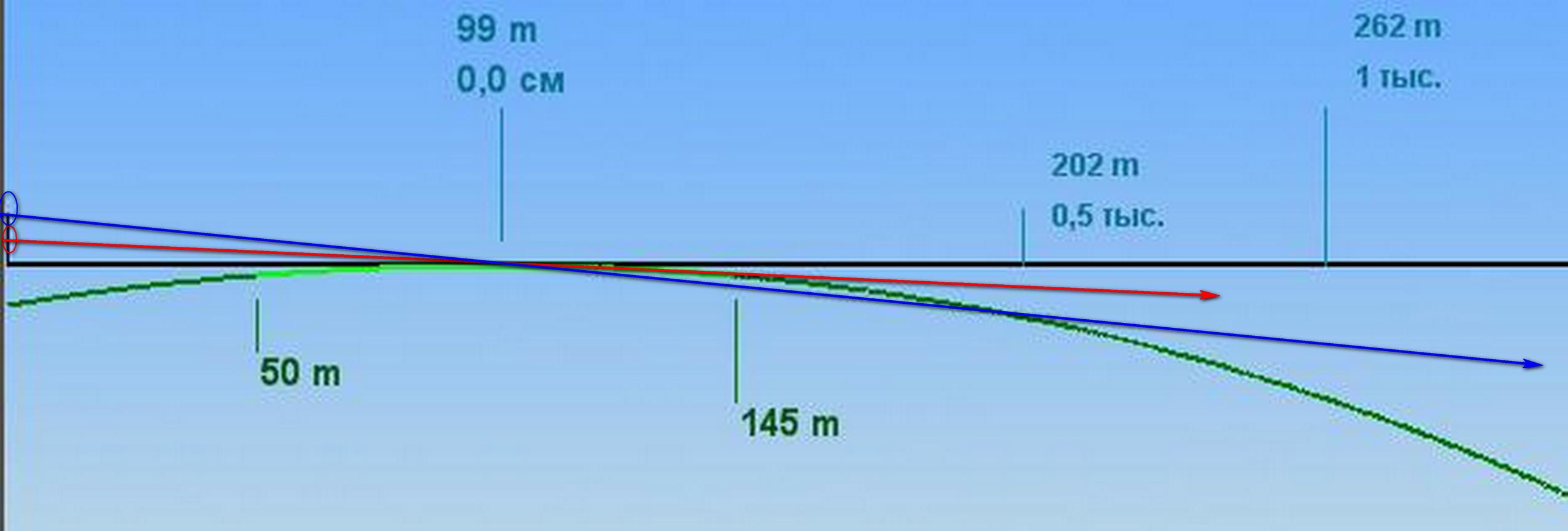 Многие пристреливают оптику на 100м и далее пользуются поправками. Для более высоко установленной оптики это будет примерно как на РИС 2. И так же разными цветами я показываю что будет , если установить оптику выше.