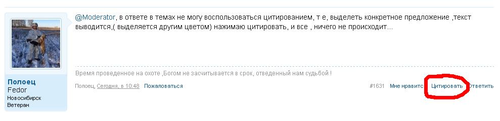 Не нужно выделять то что вы хотите процитировать, нужно нажать кнопку цитировать пот тем постом от куда вы хотите взять этот текст. Безымянный.JPG