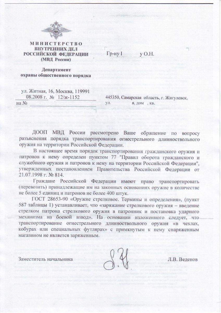 Понятия «разряжен», то здесь есть разночтения. Большинство владельцев наивно полагают, что ружье или карабин должны быть без магазина или с пустым магазином. И это их мнение поддерживают сотрудники ГИБДД. Но вот начальник лицензионно-разрешительной системы при МВД РФ Л.В. Веденов совершенно верно разъяснил в письме 12/ж-1152 от 02. 08.2008, что «оружие считается заряженным при введении в патронник патрона и постановке УСМ на боевой взвод», «следовательно, оружие с примкнутым снаряженным магазином не является заряженным».