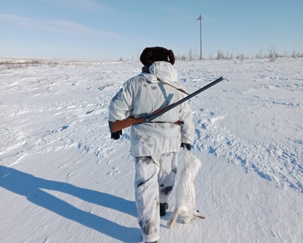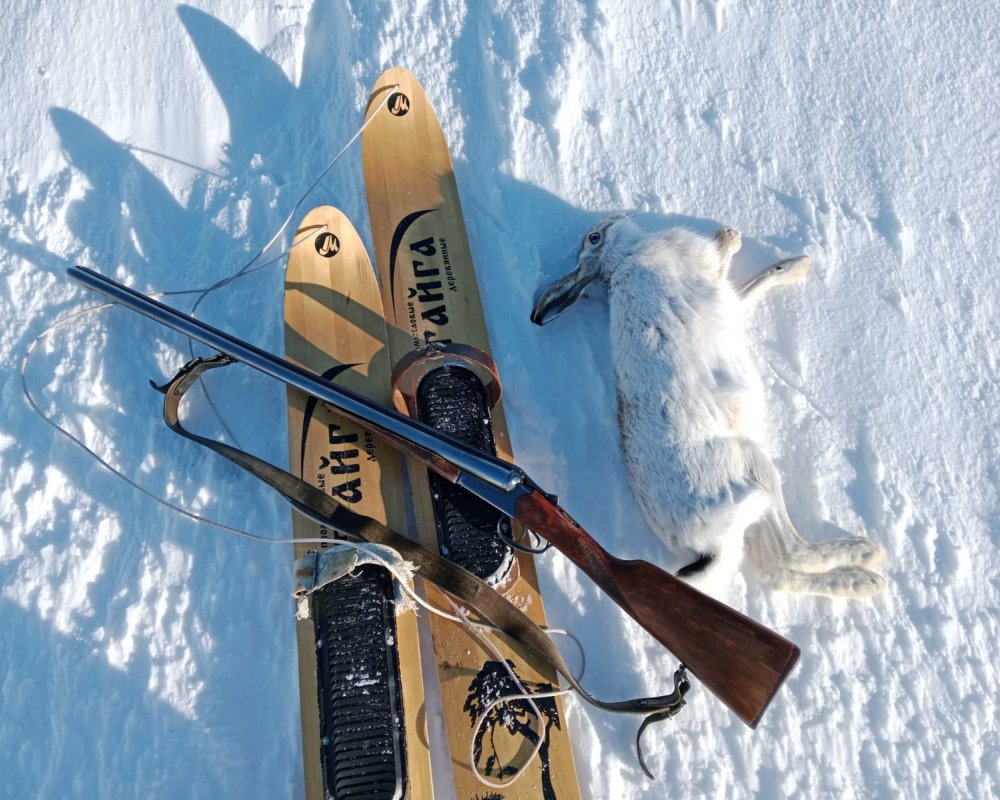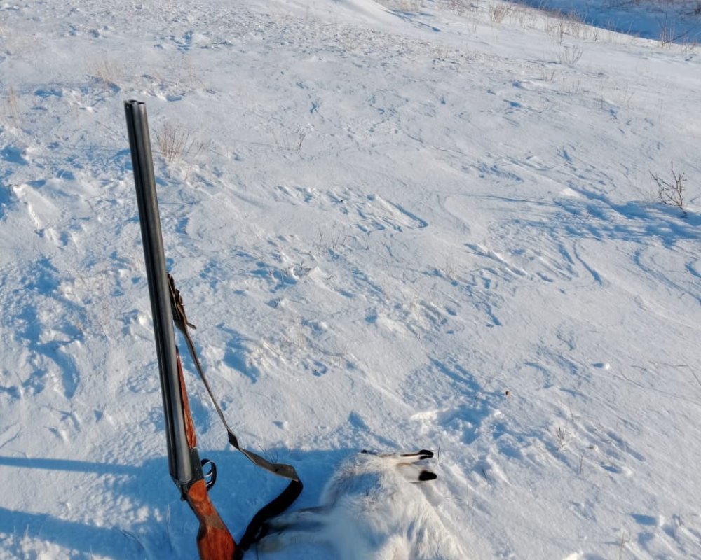 —30*, по Цельсию. Однако ветер меняется и утих, выглядывает солнышко и мы с Юриком уже в Сибиряке. Решаем пройтись, без фанатизма, взять пару косых и довольствоваться хорошим настроением. Если судить по присутствию следов— вчера, после обеда были охотники. Для нас это не критично. Быстро обговариваем ситуацию и Юра режет степь, а я спускаюсь в балку, выставлясь в кустах чилиги. Солнце так приятно светит и я тепло одет—стоять дюже комфортно. Через время с шумом пролетает партия куропатки. Думал что Юра уже спустился со степи слева и шуганул партёшку. Однако нет, похоже поднял их косой, который через время прискакал справа и не спеша зашел в густую чилигу, в пределах моей видимости. Теперь надо думать, как встать удобнее, дабы не упустить. С места не сходя, продавливаю снег, что бы приспуститься в кусту и просматривать две стороны. Всё равно, как и всегда, косой появляется неожиданно и уходит не доходя слева. Бью без раздумий, на приличной дистанции—нолёвка в латуни, дымарь в подсыпке, порох Барс, срок действия до 1998 года. Основной пыж войлочный, осаленный, добавочный ДВП. Пластиковая заглушка. Косой подпрыгивает и затихает. Матёрый. Дальше перемещаемся в посёлок. Юра отвлекается на рыбалку неподалеку от дома, с шурином и дочкой. Я ухожу на круг и уже потом связываюсь по рации с Юрой. Косой по речке был. Упластались мы порядком, да только взял Юрик косого, всё красиво, как всегда. Меня ждал приятный сюрприз — косой при взвешивании потянул на 5450. Это лучший результат команды на сегодня. Две дробины—одна, пробив грудину и в сердце, вторая в голову. Жирок, для этого времени, очень приличный. Главное —мы в настроении и строим планы, как на конец сезона, так и на вЁсну, по крякашам. Всем хорошего настроения!